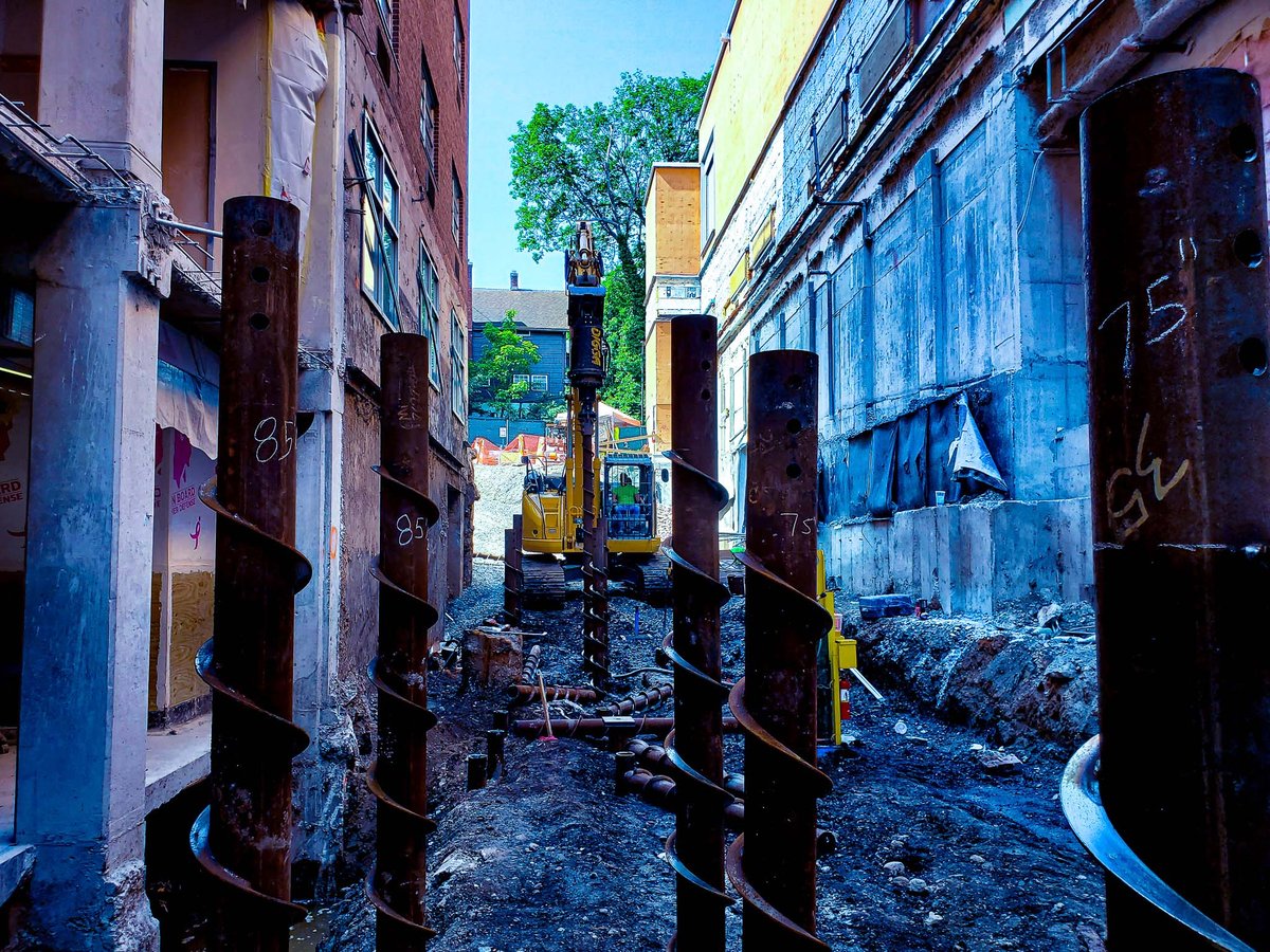 Limited access on the hospital grounds presented another challenge. Most of the piles had to be installed in the 15 feet wide area between the south and southeast wings of the hospital. With barely enough room to fit an excavator between the two wings, any pile types relying on bulky installation equipment could not be used.