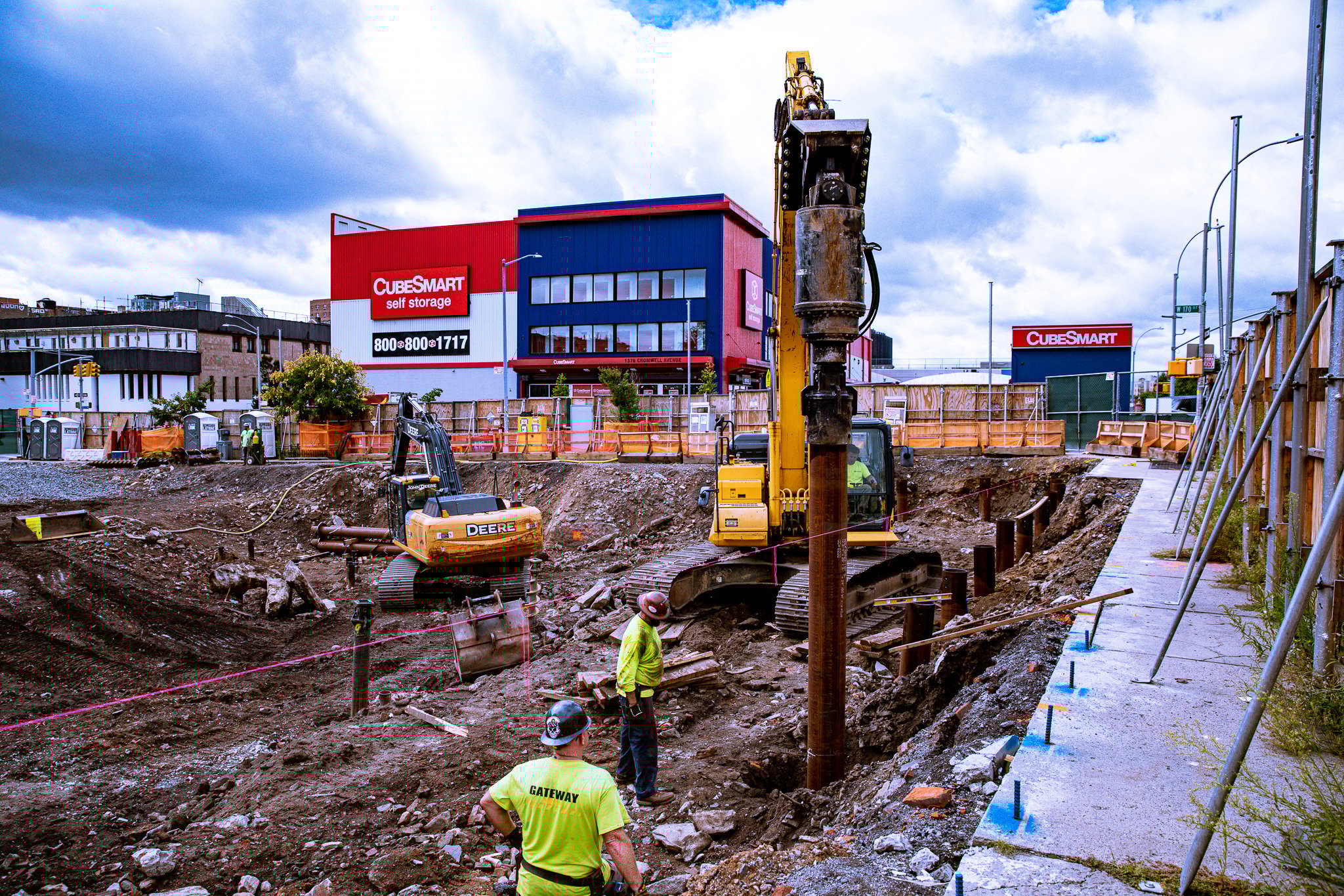 Initially, the SOE wall was to be constructed using a drilled H-pile system. However, only 18 piles were required, and this system would have been inefficient and could not meet the schedule. An IDEAL representative recommended Helical Pipe piles to the Long Island Concrete team as an SOE wall solution. STELCOR Drilled-in Displacement Micropiles also needed to be installed for the building foundations, so it was a perfect fit.