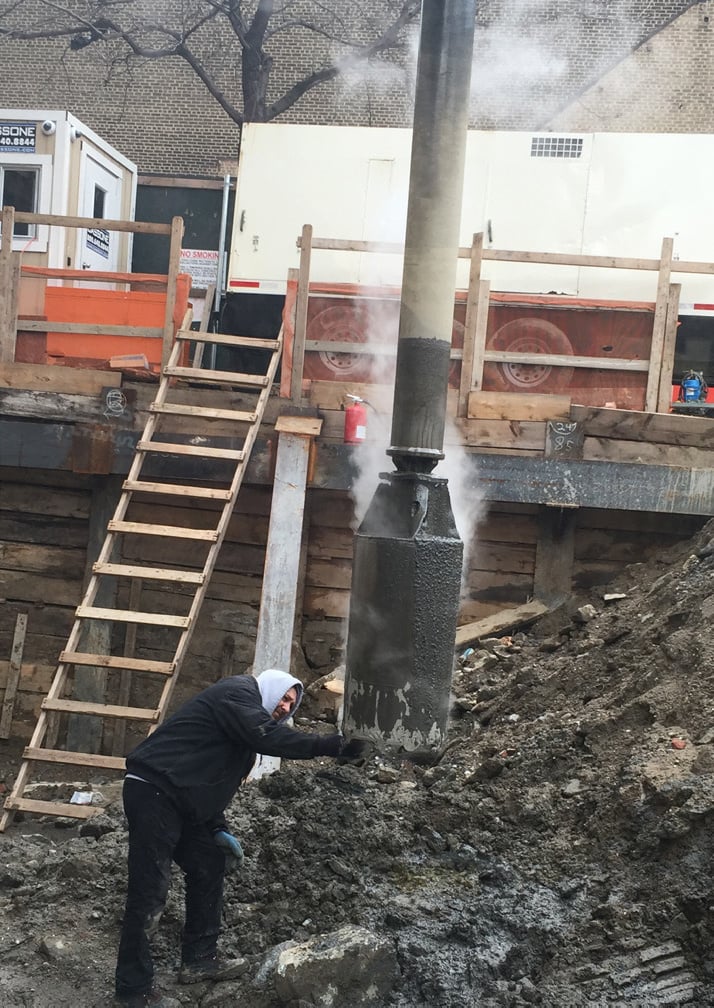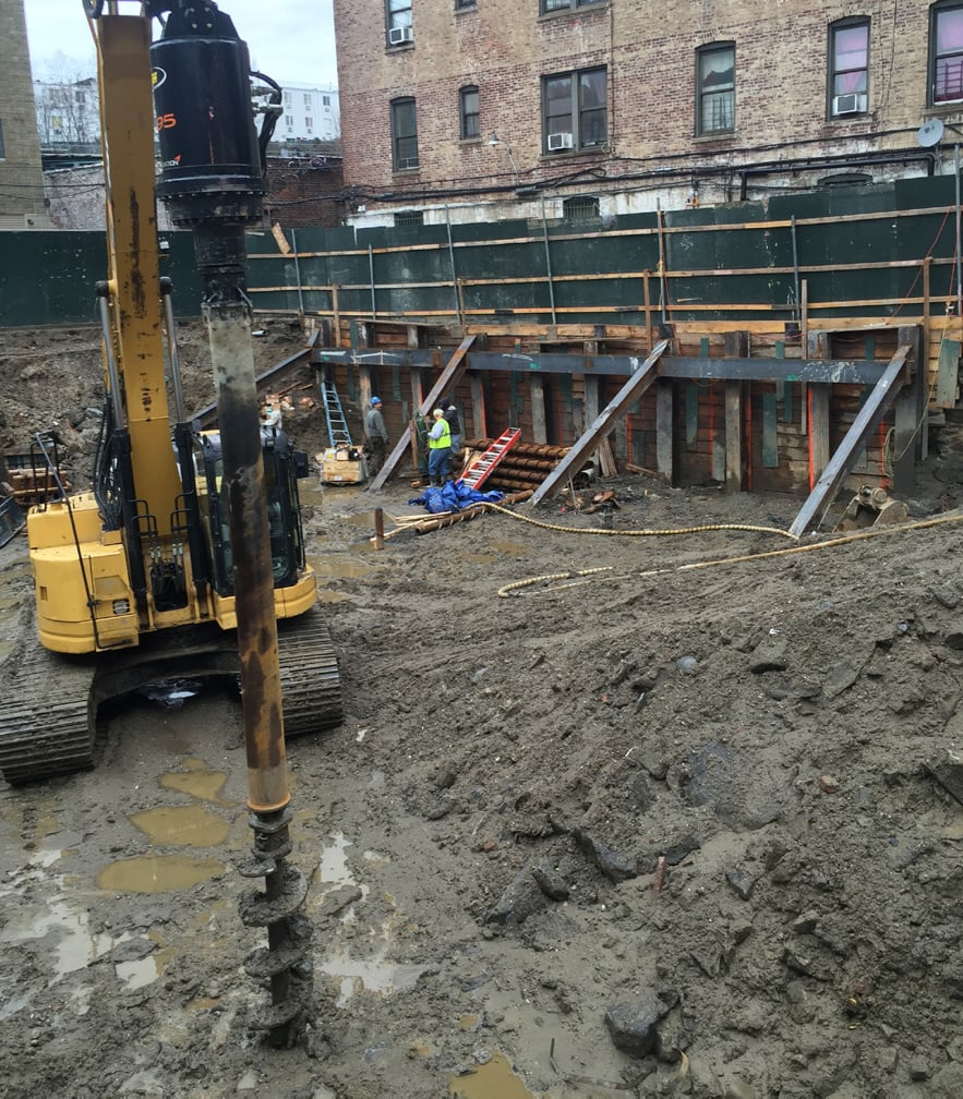 The site challenges included a high water table and rubble foundations of the neighboring buildings which were not underpinned. Boulders were encountered up to 15’. The project was originally spec’d with Drilled Shaft Case Piles which could be installed at a rate of 1.5 piles per day and were much more expensive. Furthermore, the cost of spoil removal was cost prohibitive and oil was present in the contaminated groundwater.